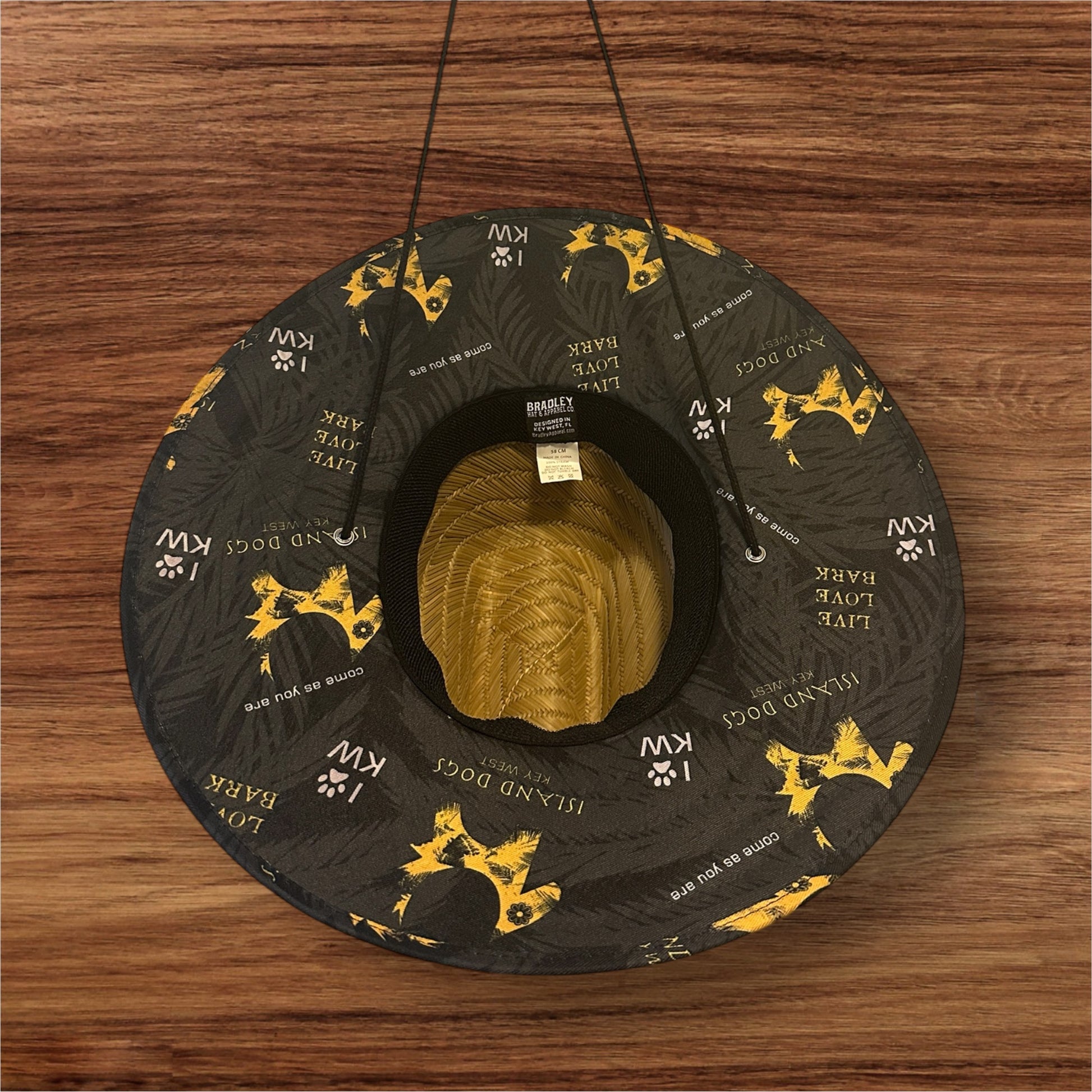 Straw/Beach Hat. Flat Brim w/ Logo. Graphic Cotton Logo underneath with Drawstring.